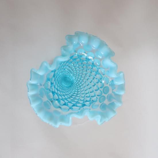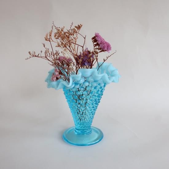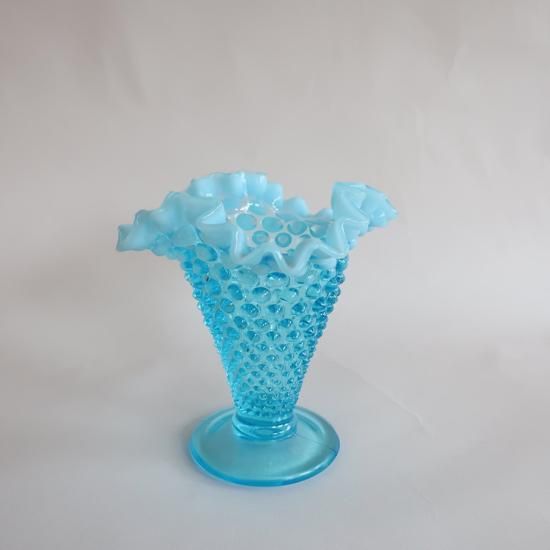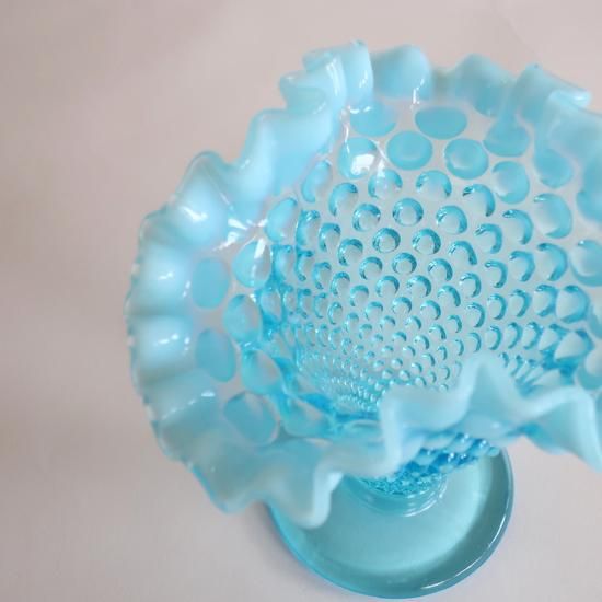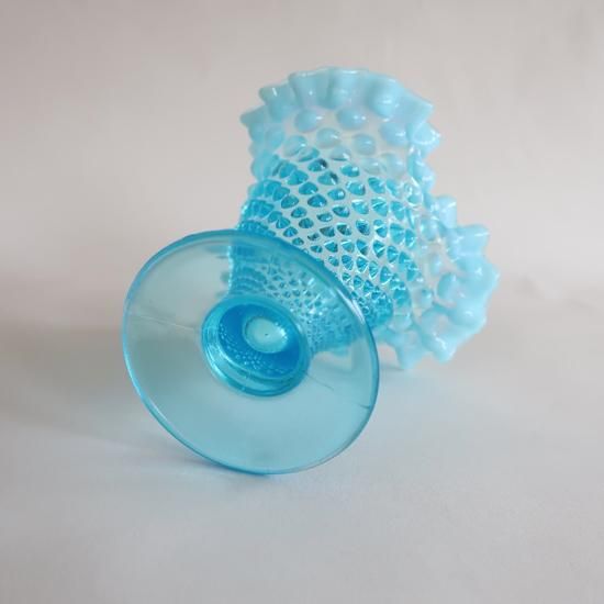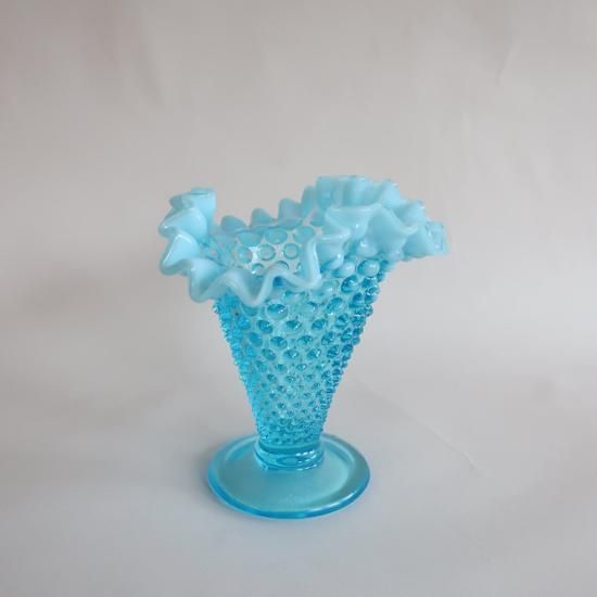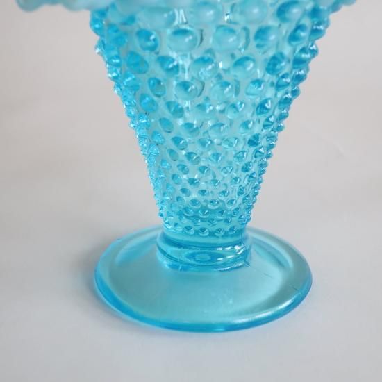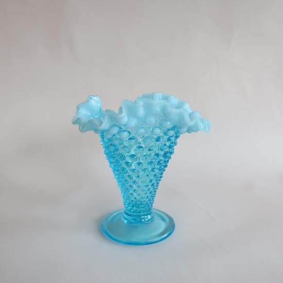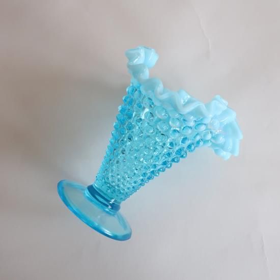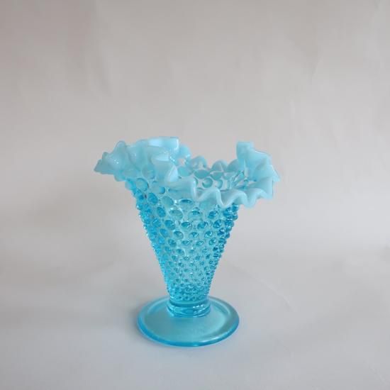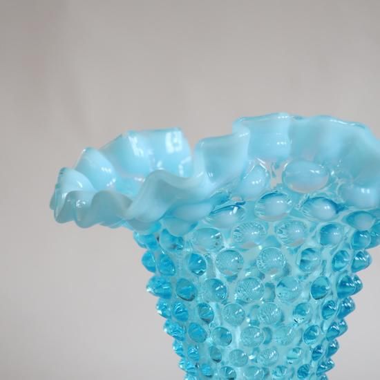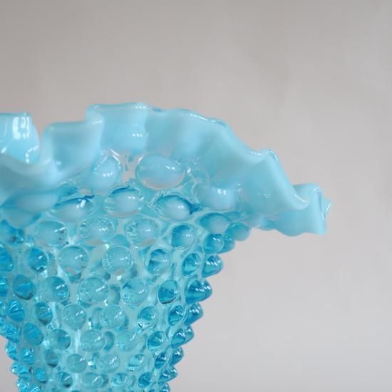 アメリカで買い付けましたVintage Fenton Glass Aqua Blue Opalescent Hobnail Ruffled Vase/ビンテージ フェントン社製 フラワーベース/花器/花瓶(811)です。
