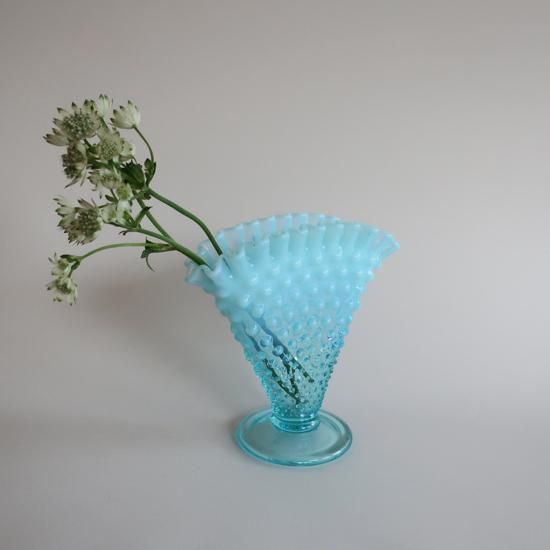 アメリカで買い付けましたVintage Fenton Glass Aqua Blue Opalescent Hobnail Ruffled Fan Vase/ビンテージ フェントン社製 フラワーベース/花器/花瓶(935)です。