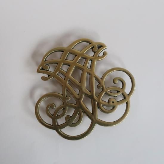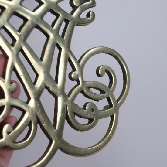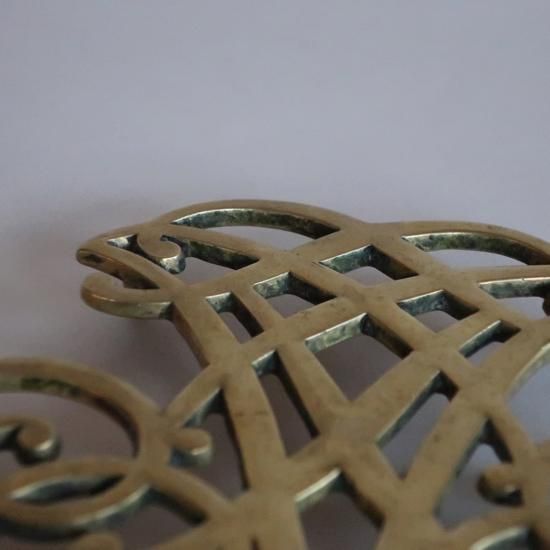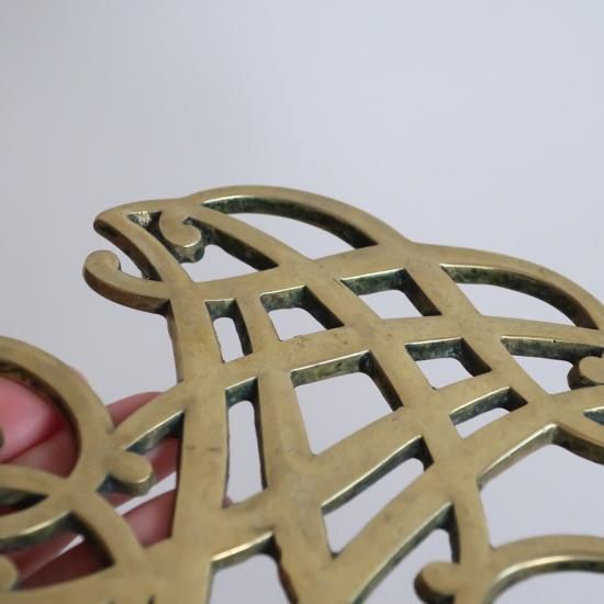 真鍮で出来ている鍋敷きで、くり抜きのデザインと脚付きなのが可愛らしいです。