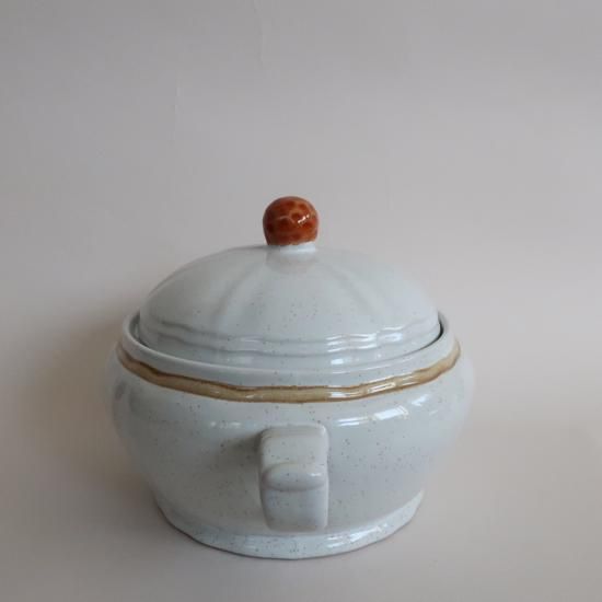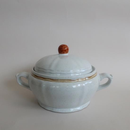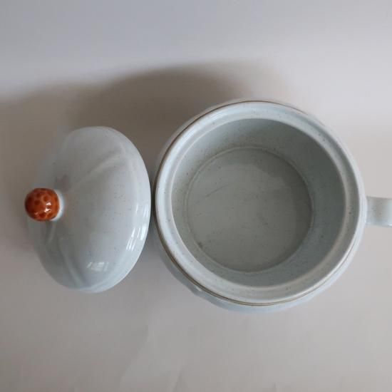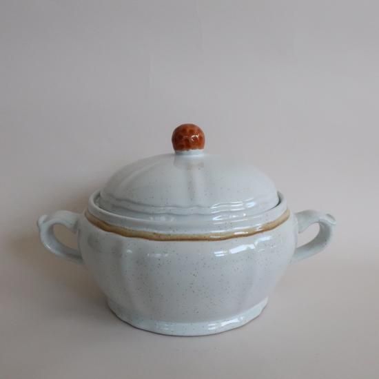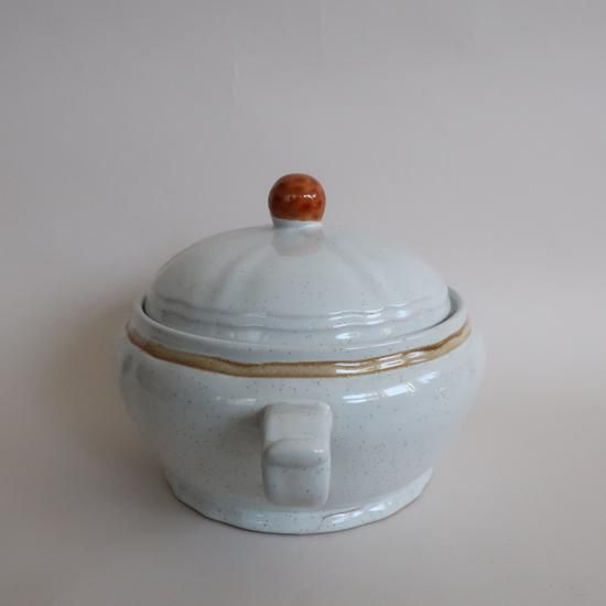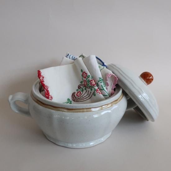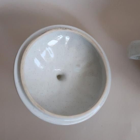 クラック(ヒビ割れ)があるので、サービングポットとしてではなく、ハンカチやランチョンマットを収納したり、ペットフード入れにしたり、調味料をストックしたり、そんな感じの小物入れとしてオススメです。