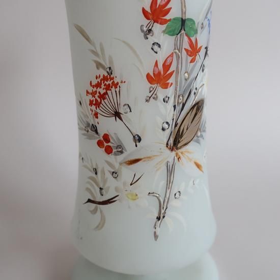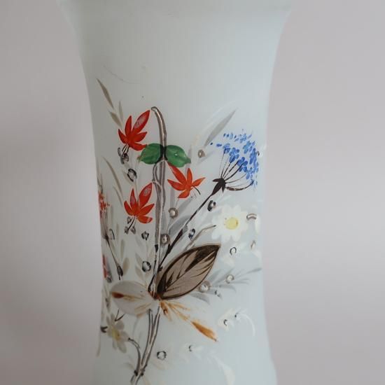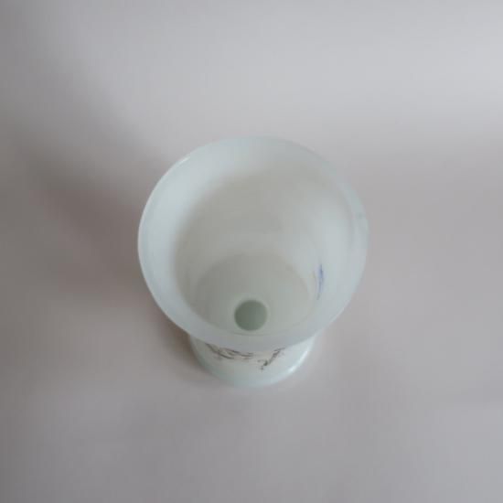 フロストガラスのマットな質感、ハンドペイントの繊細な柄が素敵な花瓶です。