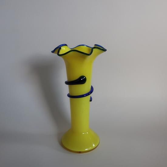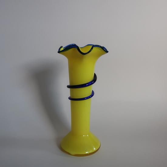 ハンドメイドでイエローとブルーの組み合わせとフリルのデザインが可愛い花瓶です。