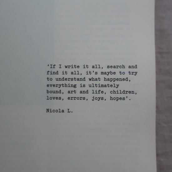 「もし私がすべてを書き、すべてを探し、見つけるとしたら、それは何が起こったかを理解しようとするためかもしれない。すべては最終的に結びついている。アートと生活、子供、愛、誤り、喜び、希望」―ニコラ・L