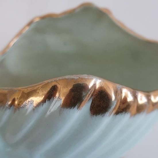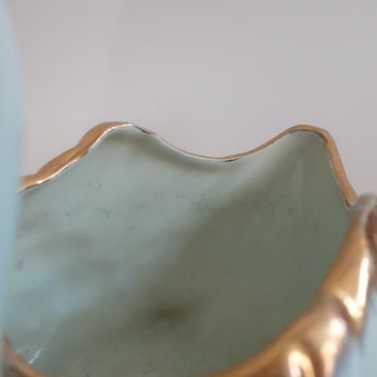 ほんのりブルー、グリーンがかった色味にゴールドのペイントがとても可愛いデザインです。