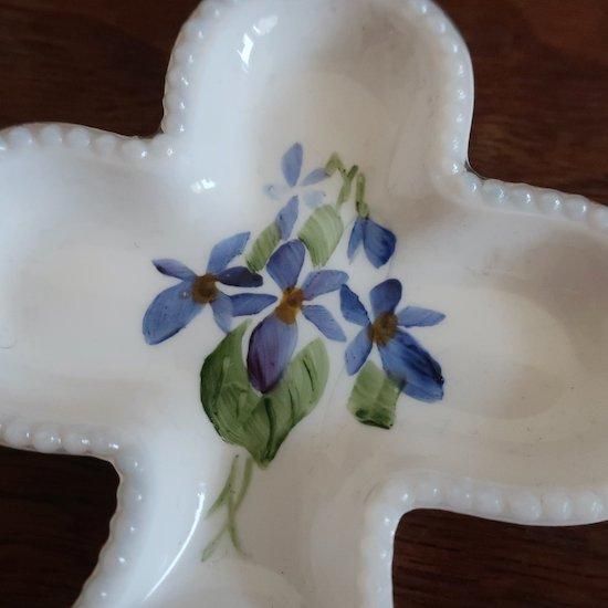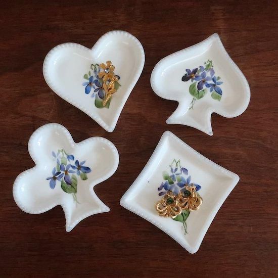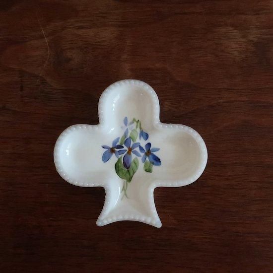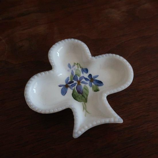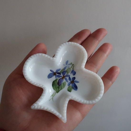トランプモチーフの形とハンドペイントのすみれの絵が美しいミルクガラスでできたミニプレートです。