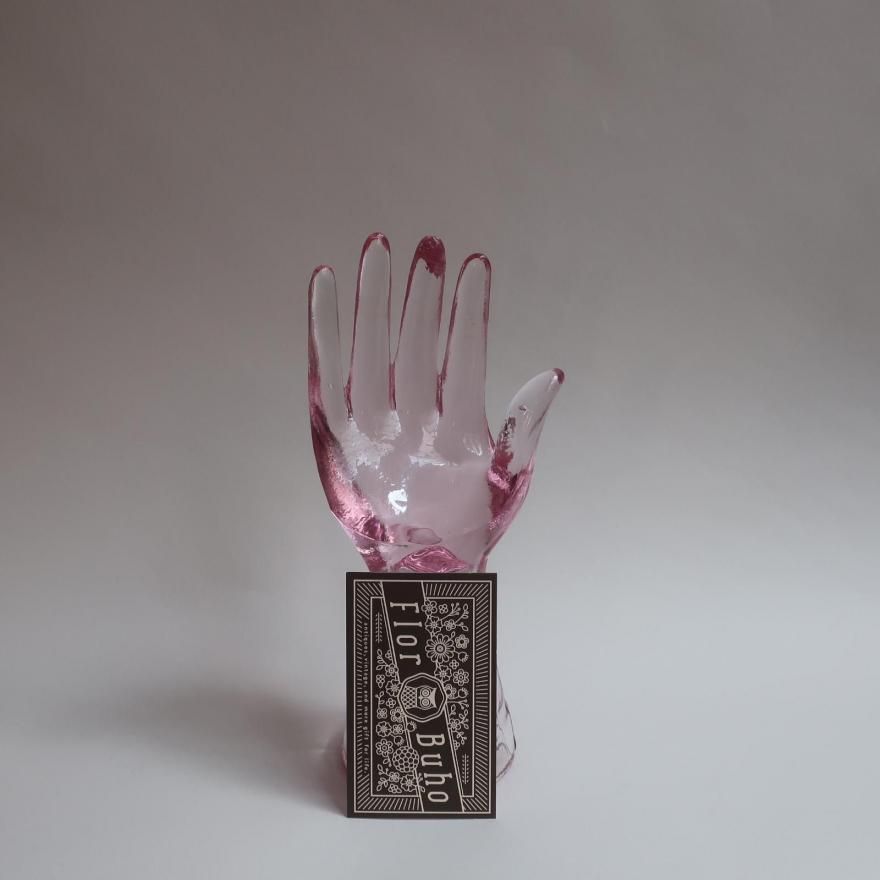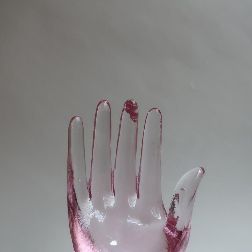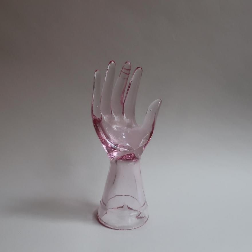 手のモチーフがユニークなガラスで作られたオブジェです。リングホルダーですが、オブジェとして人気のアイテムです。