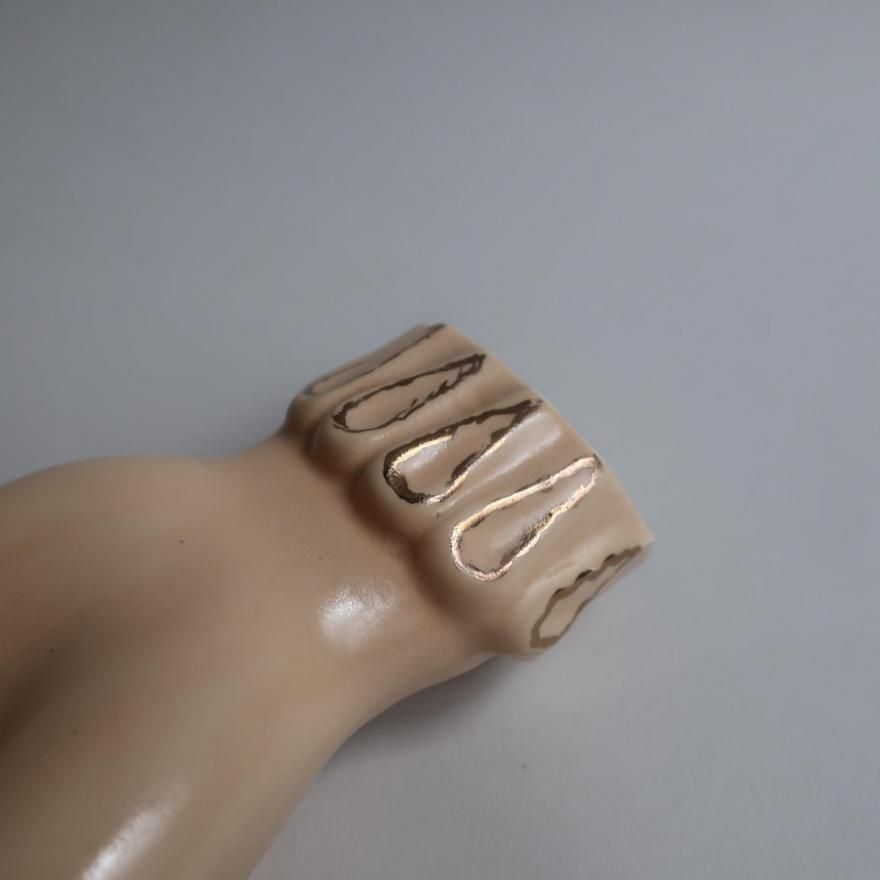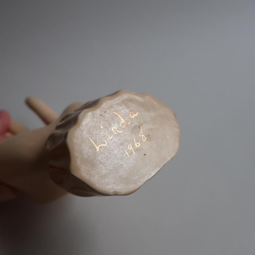 Lindaという名前と1968と記載されており、めずらしいベージュカラーにゴールドの絵付けのデザインです。
