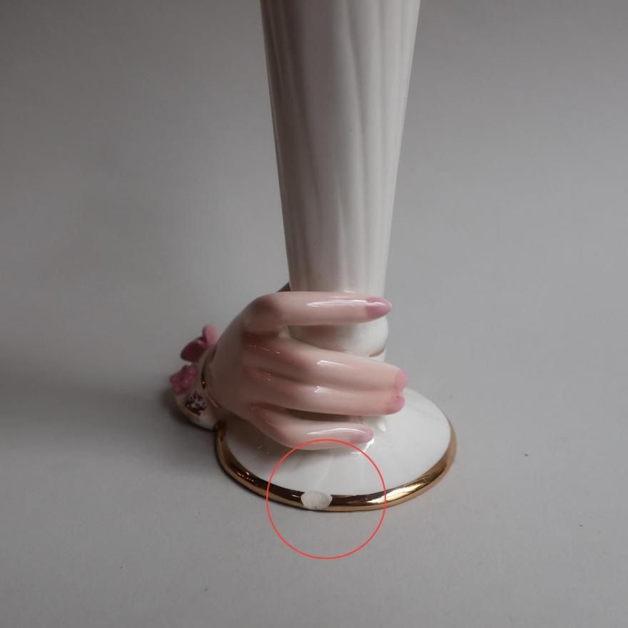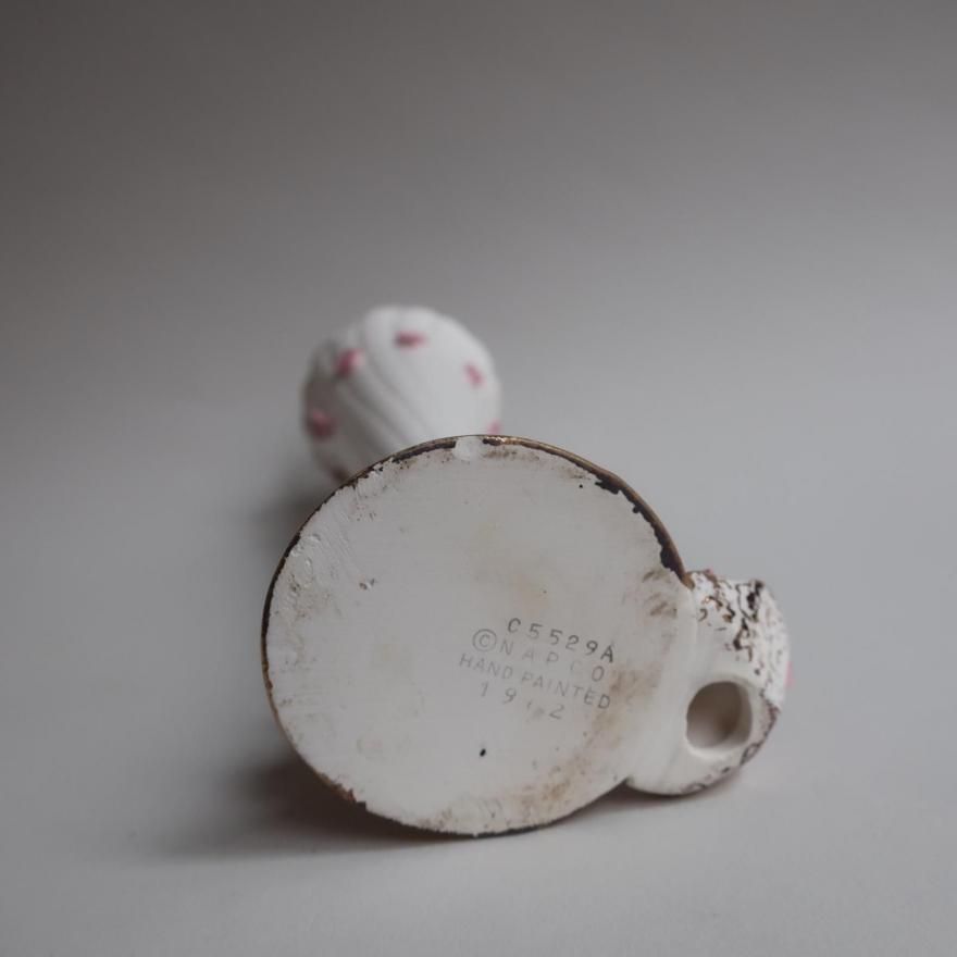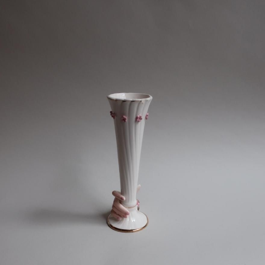 淡いピンクにピンクの小花柄と手のモチーフに、ゴールドの絵付けが華やかでとても可愛いです。