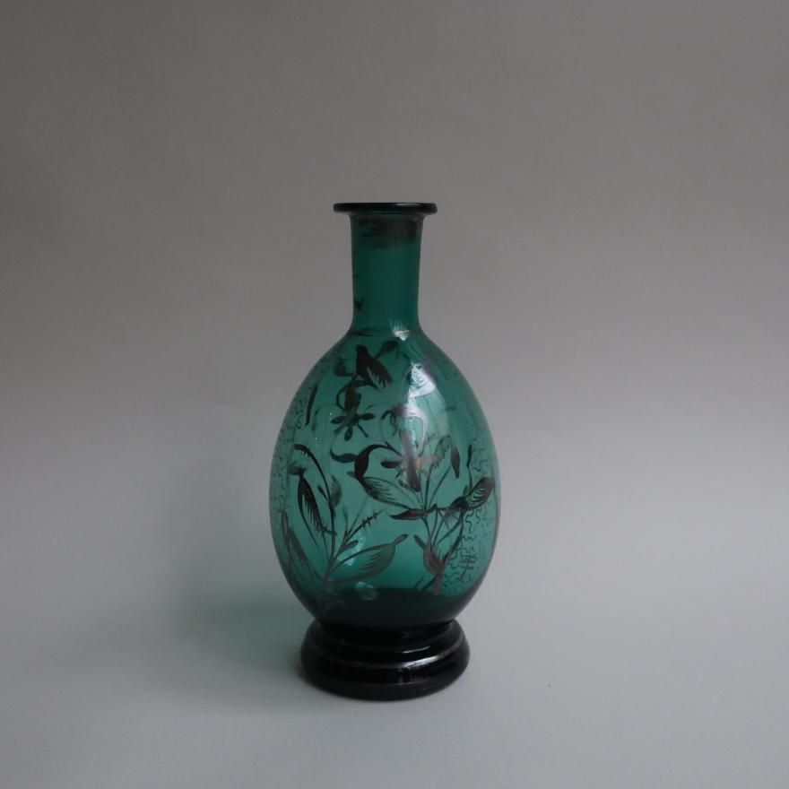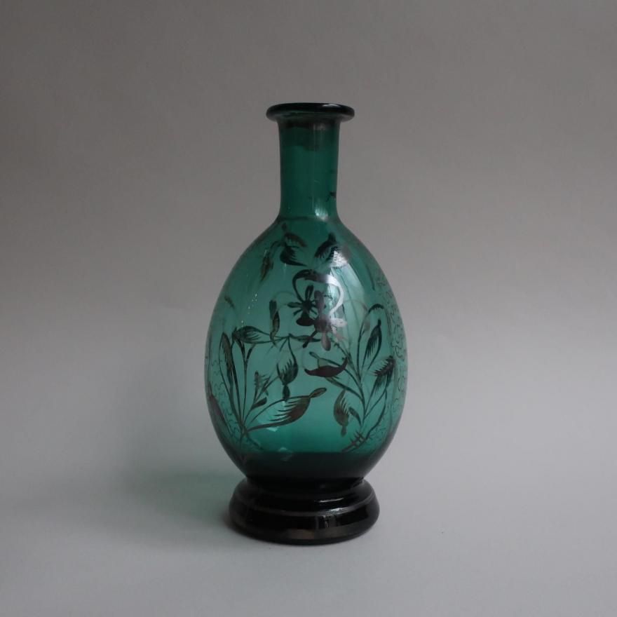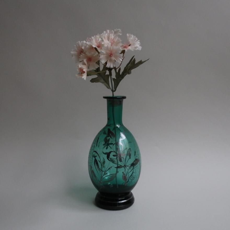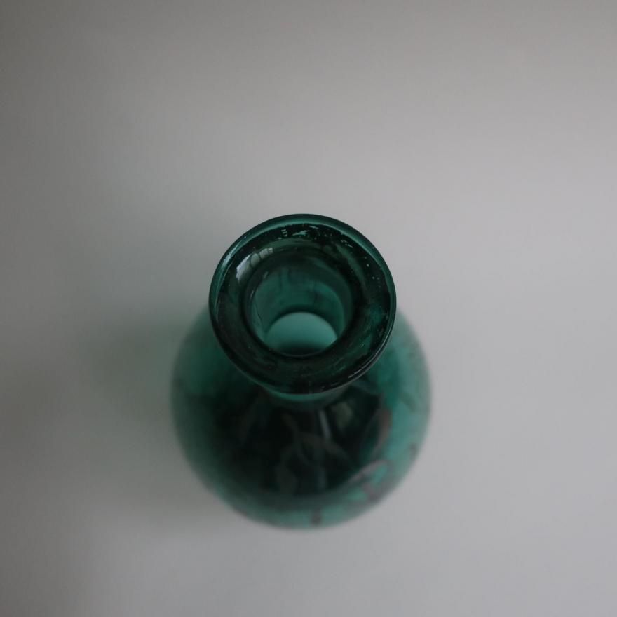 Antique green glass silver overlay floral Flower Vase (B390)/アンティーク グリーン ガラス 花柄 シルバーオーバーレイ フラワーベース /花器/一輪挿しです。