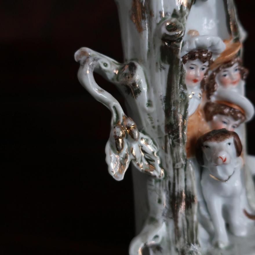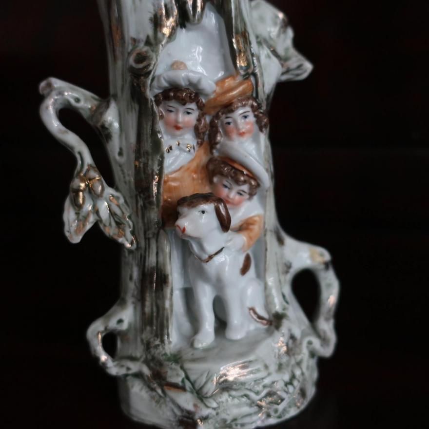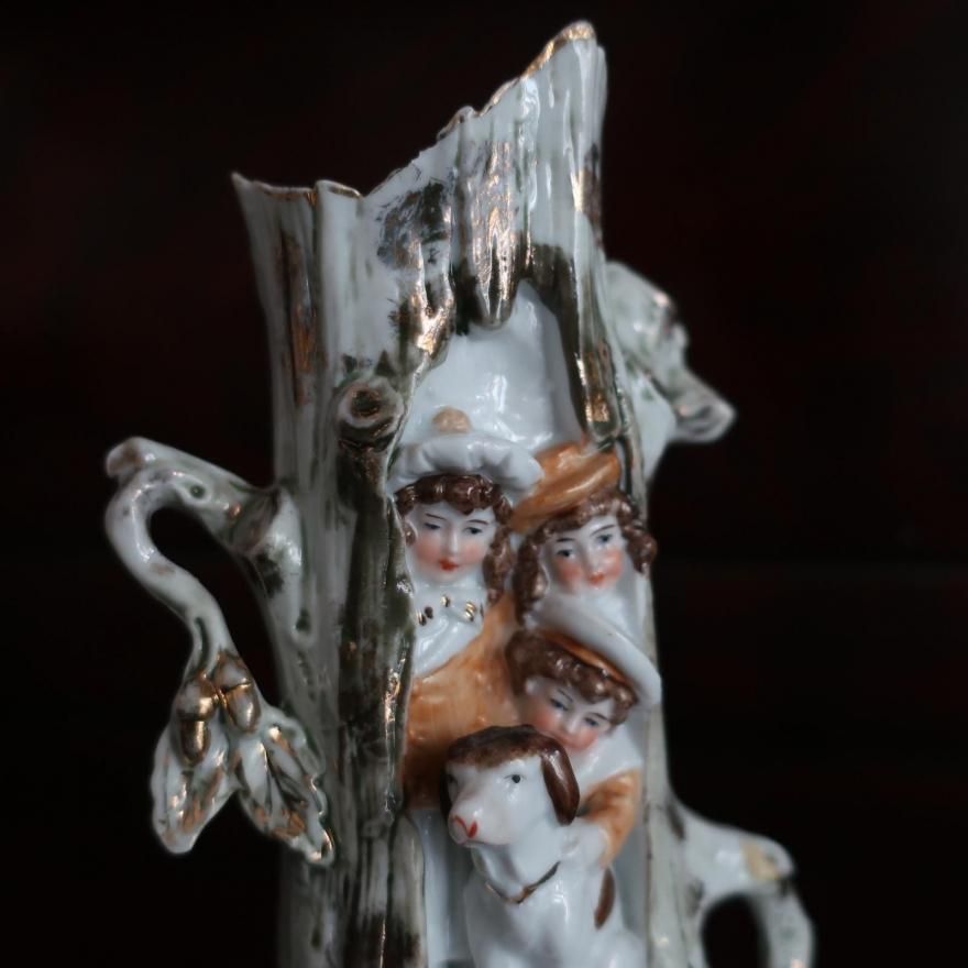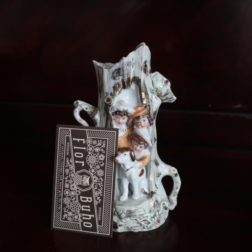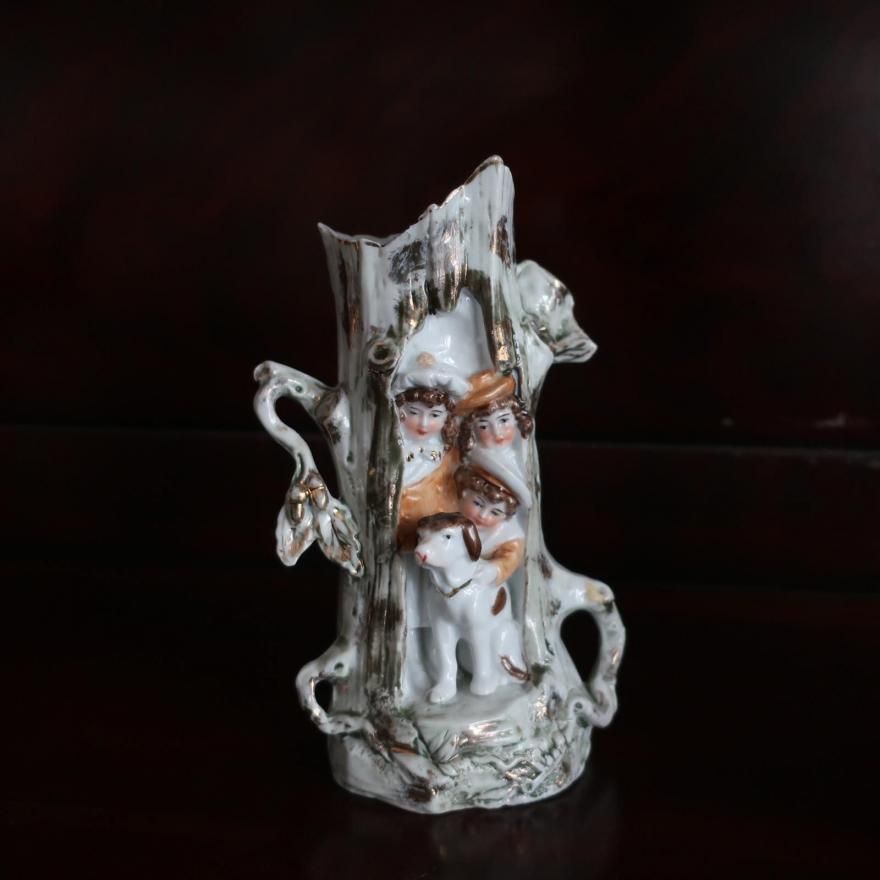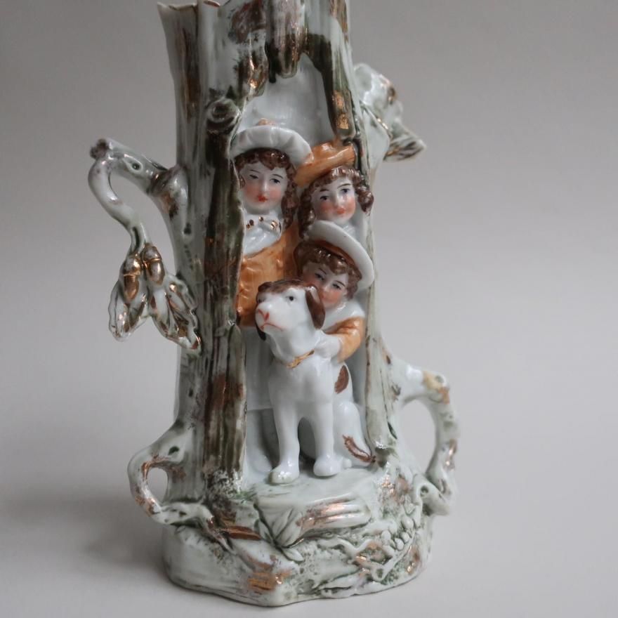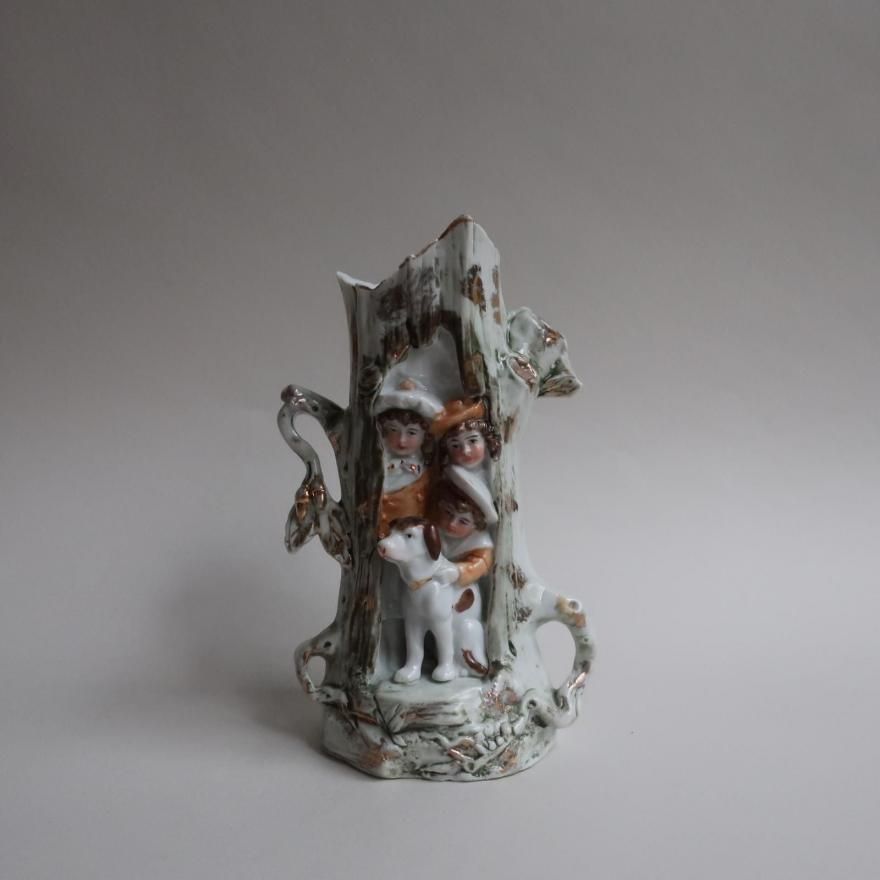 木の間から子供が三人と犬が覗き込んでいるデザインがとても可愛らしく、立体的で作り込みが細かく、めずらしいデザインのフラワーベースです。色味や、ハンドペイントで描かれた顔の表情や、アクセントのゴールドの絵付けも全て可愛いです。