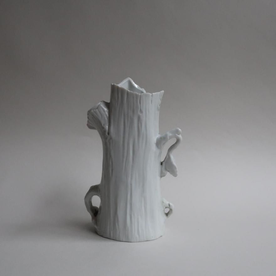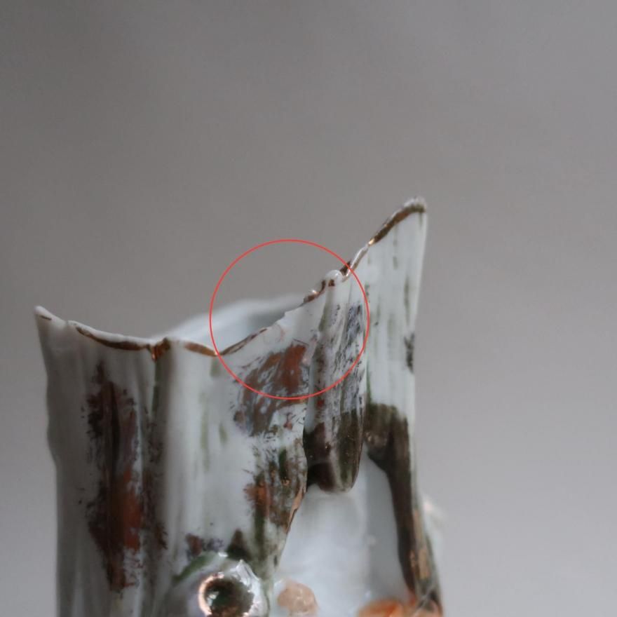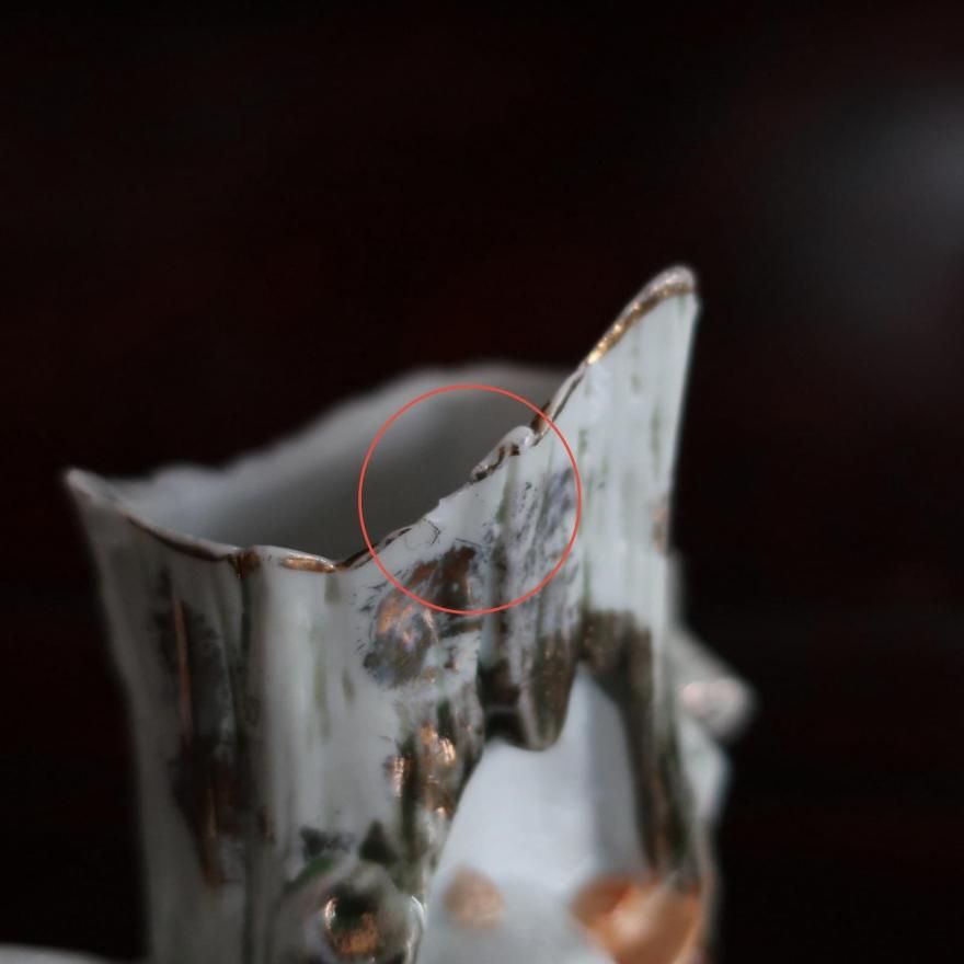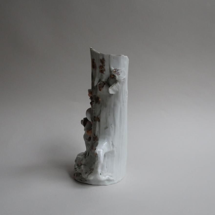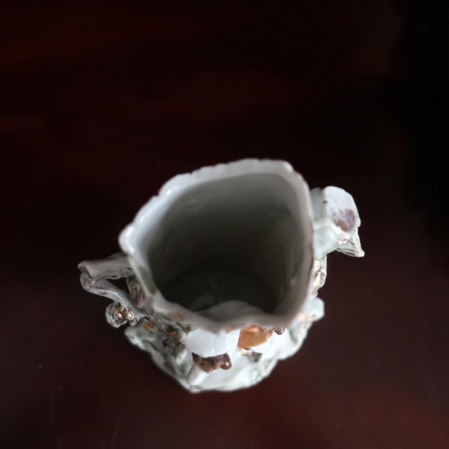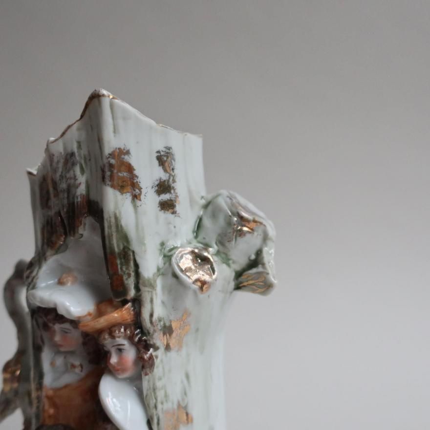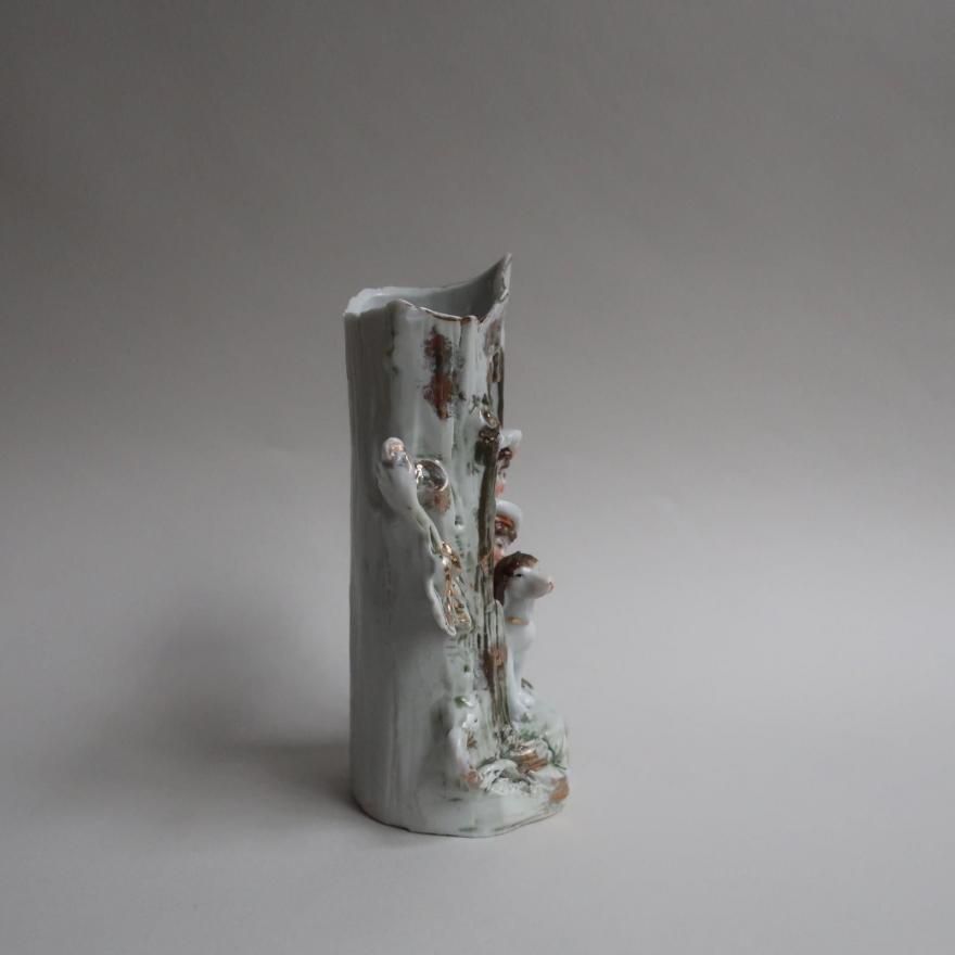 木の間から子供が三人と犬が覗き込んでいるデザインがとても可愛らしく、立体的で作り込みが細かく、めずらしいデザインのフラワーベースです。色味や、ハンドペイントで描かれた顔の表情や、アクセントのゴールドの絵付けも全て可愛いです。