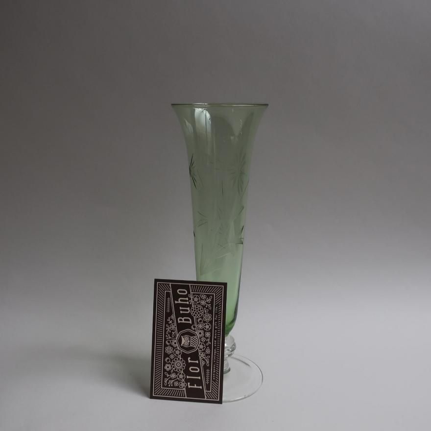 淡いグリーンのガラスに花柄のエッチング(彫り模様)が美しく素敵なフラワーベースです。