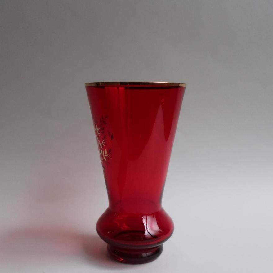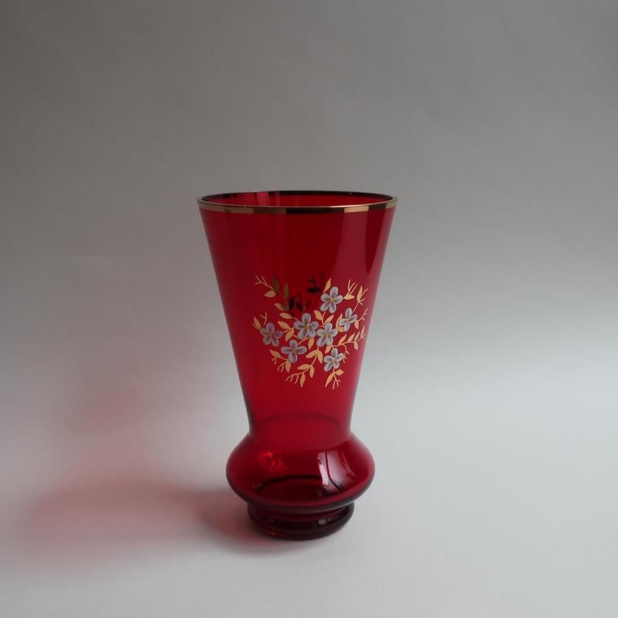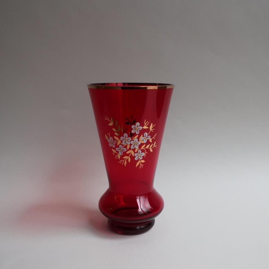 チェコスロバキア製の鮮やかな赤色のガラスに花柄のハンドペイントが美しく素敵なフラワーベースです。赤とゴールドの組み合わせが華やかでとても美しいです。